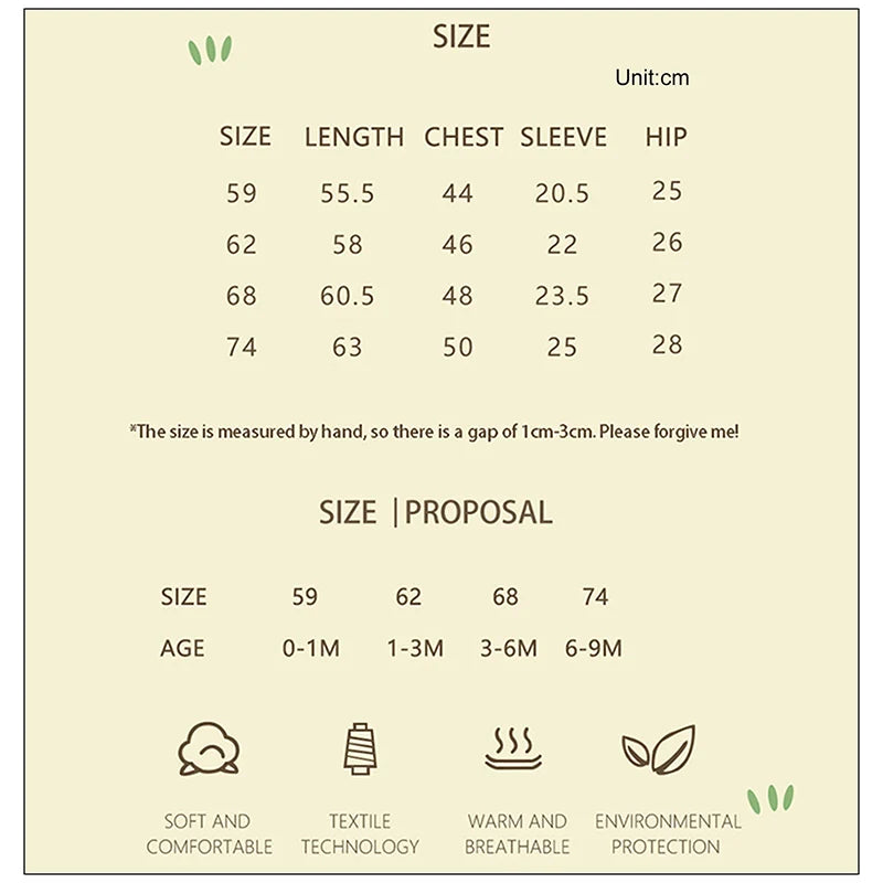 59 Longueur : 21,85 Poitrine : 17,32 Manches : 8,07 Hanche : 19,68 Âge conseillé : 0-1 mois