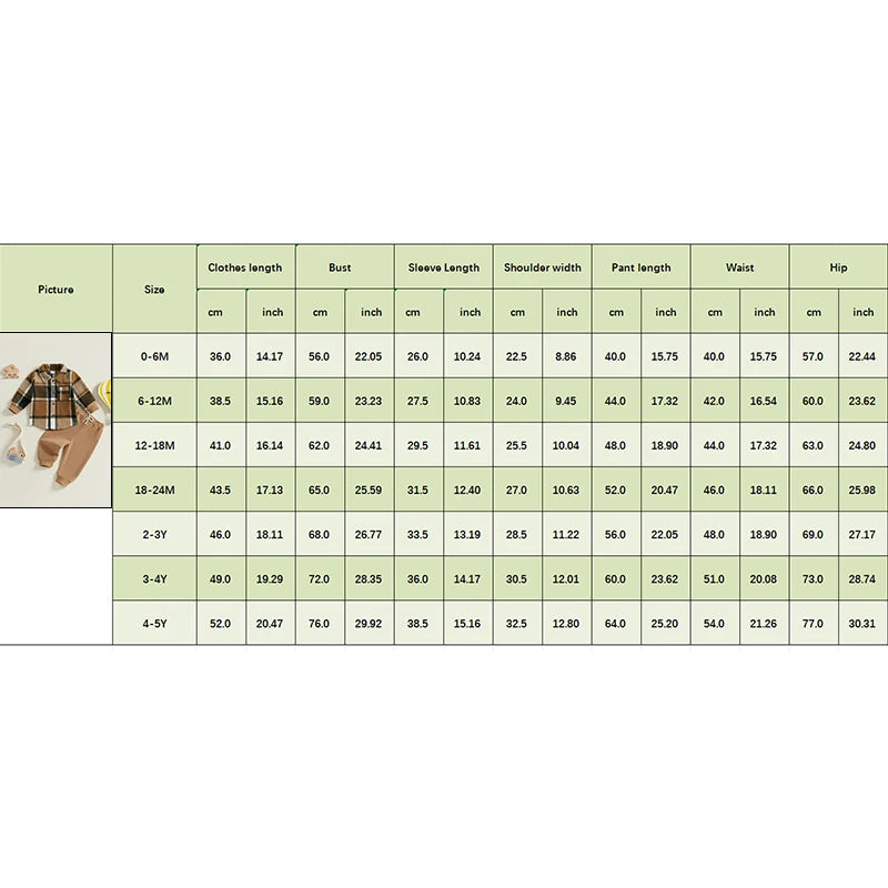 18-24M Longueur du haut : 17,13 Poitrine : 25,59 Manches : 12,4 Épaule : 10,63 Longueur du pantalon : 20,47 Taille : 18,11 Hanche : 25,98 Âge conseillé : 18-24 mois