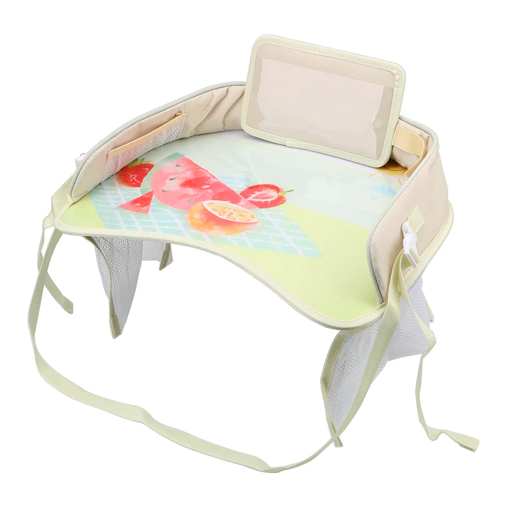Multiple pockets of travel trays or baby travel accessories store kids essentials well within reach, large surface with raised edges prevents crayons, pencils from rolling on the floor, see-through PVC pocket holds a smartphone.