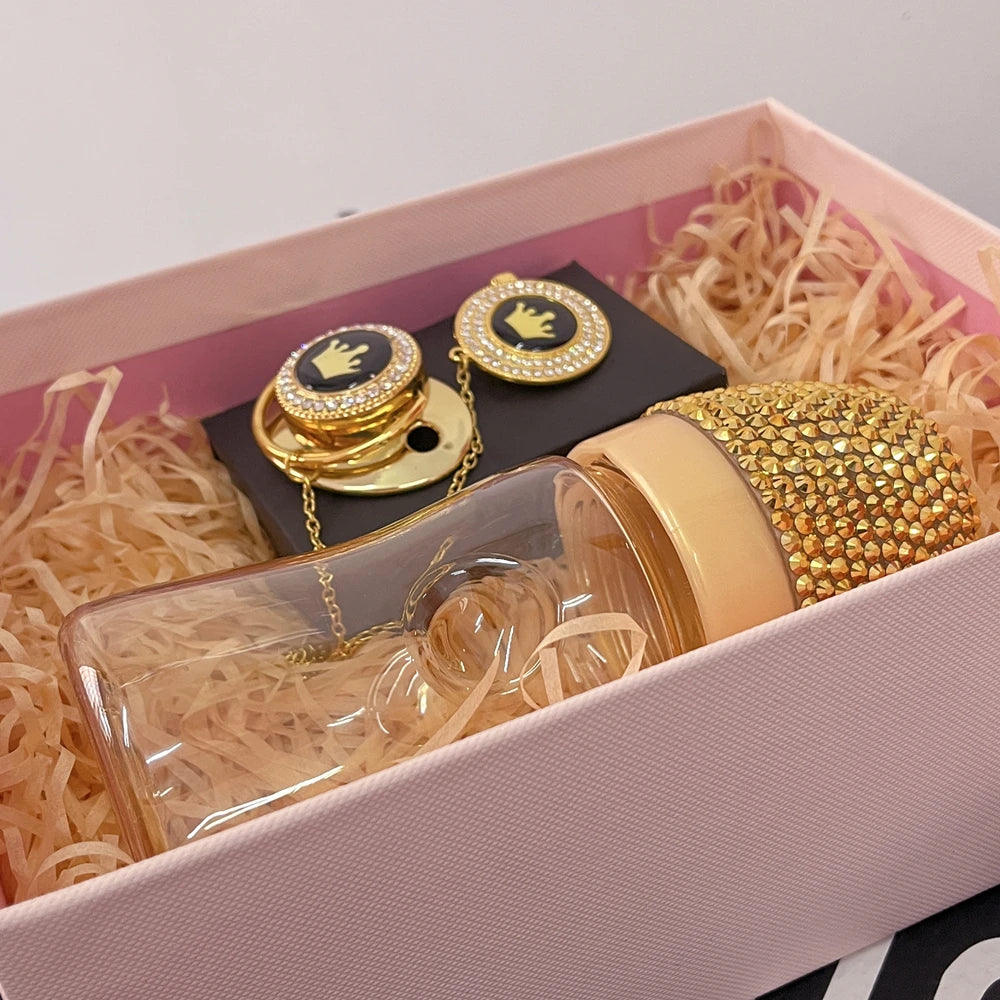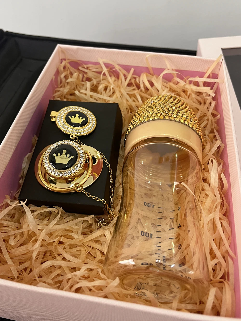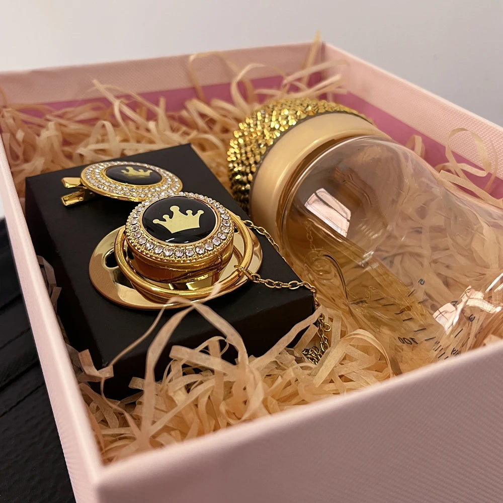 Ensemble de pinces à biberon et tétine Dollbling en cristal doré fait main pour bébé de 0 à 6 mois, couronne d'ailes angulaires pour nouveau-né, décoration de chambre d'enfant
