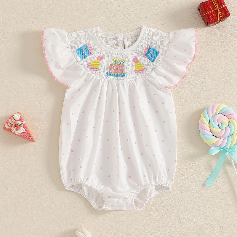 Tenue de premier anniversaire pour fille, gâteau d'anniversaire brodé, barboteuse à manches volantées, body smocké, tenues mignonnes pour bébé fille