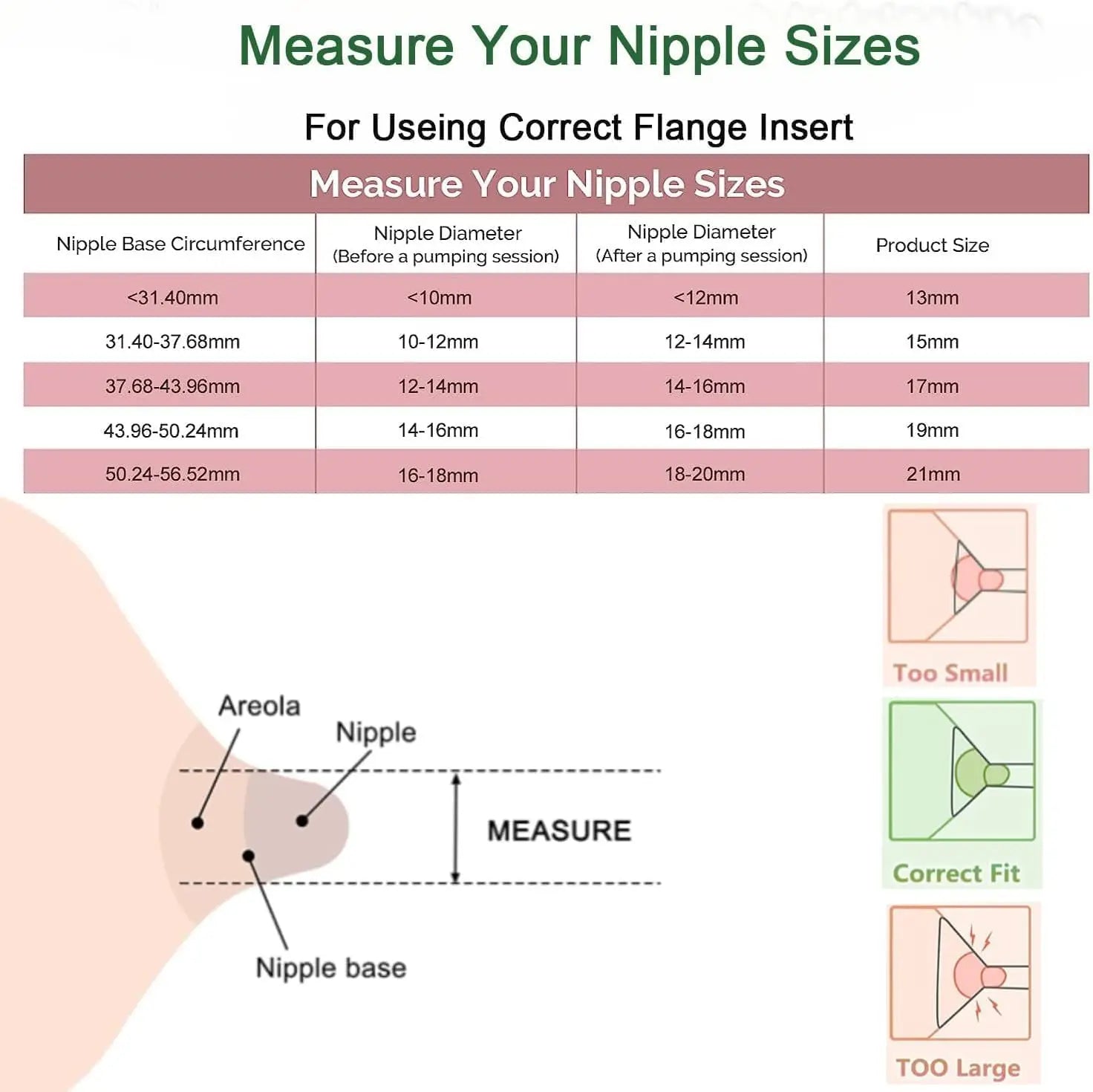 5 tailles d'inserts de bride adaptés à différents tire-laits : 13 mm, 15 mm, 17 mm, 19 mm et 21 mm, garantissant que chaque mère dispose d'un bouclier adapté.