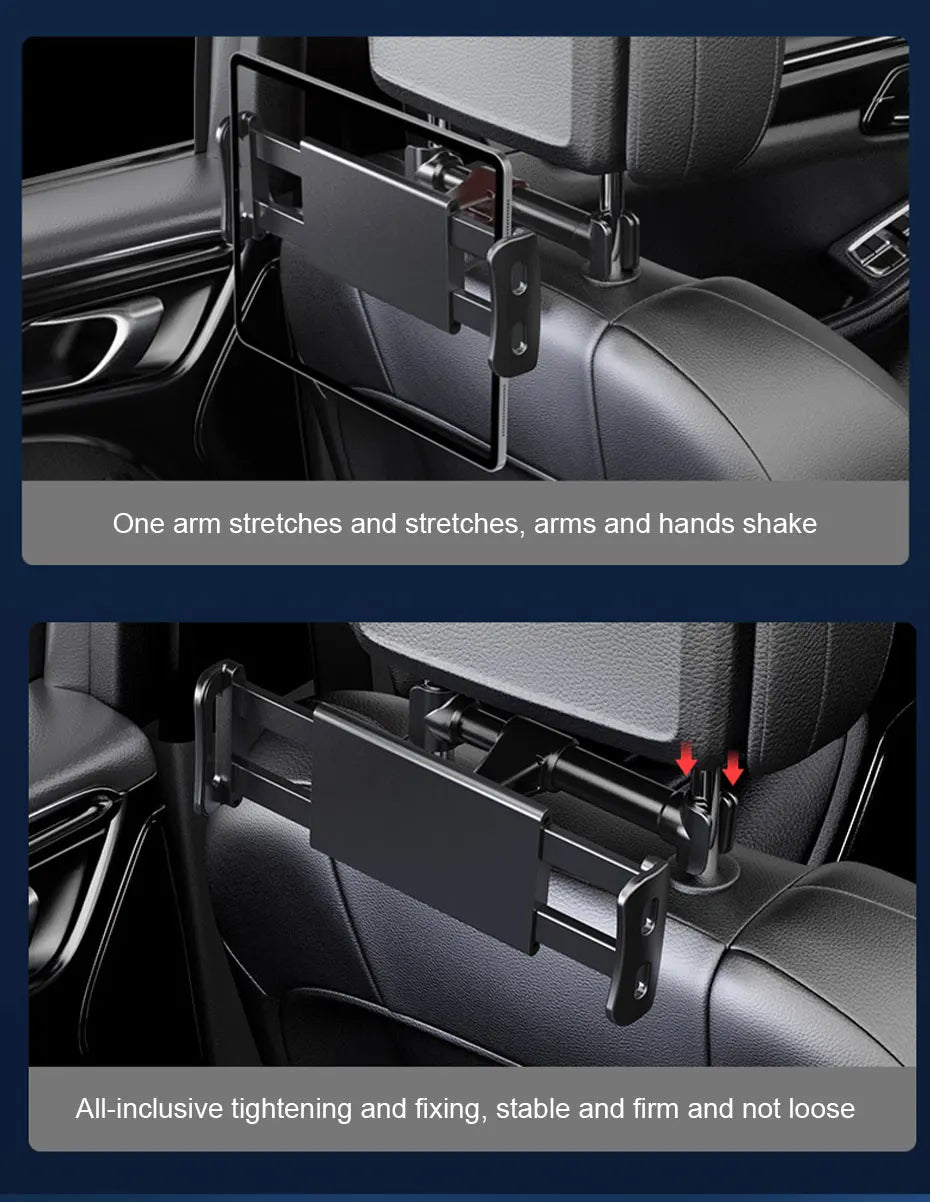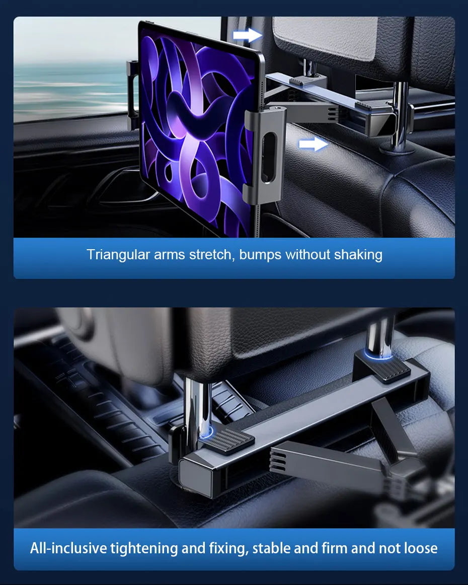 3. Shockproof Protection - The soft rubber lining protects your devices from friction, the telescoping arms can effectively prevent vibration while firmly grasping your rear seat and devices. Good car travel accessories for long trips.