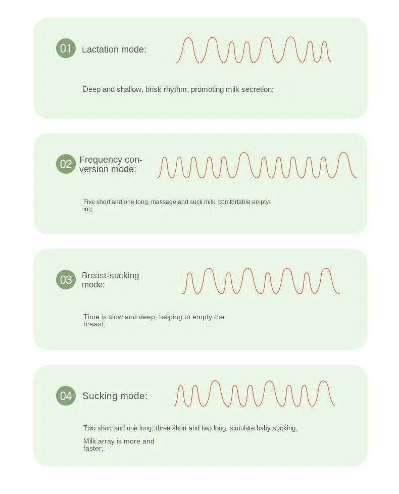 Mettez en évidence les quatre principaux modes d'aspiration mammaire, avec une force d'aspiration élevée, des mains libres et une conception anti-reflux.