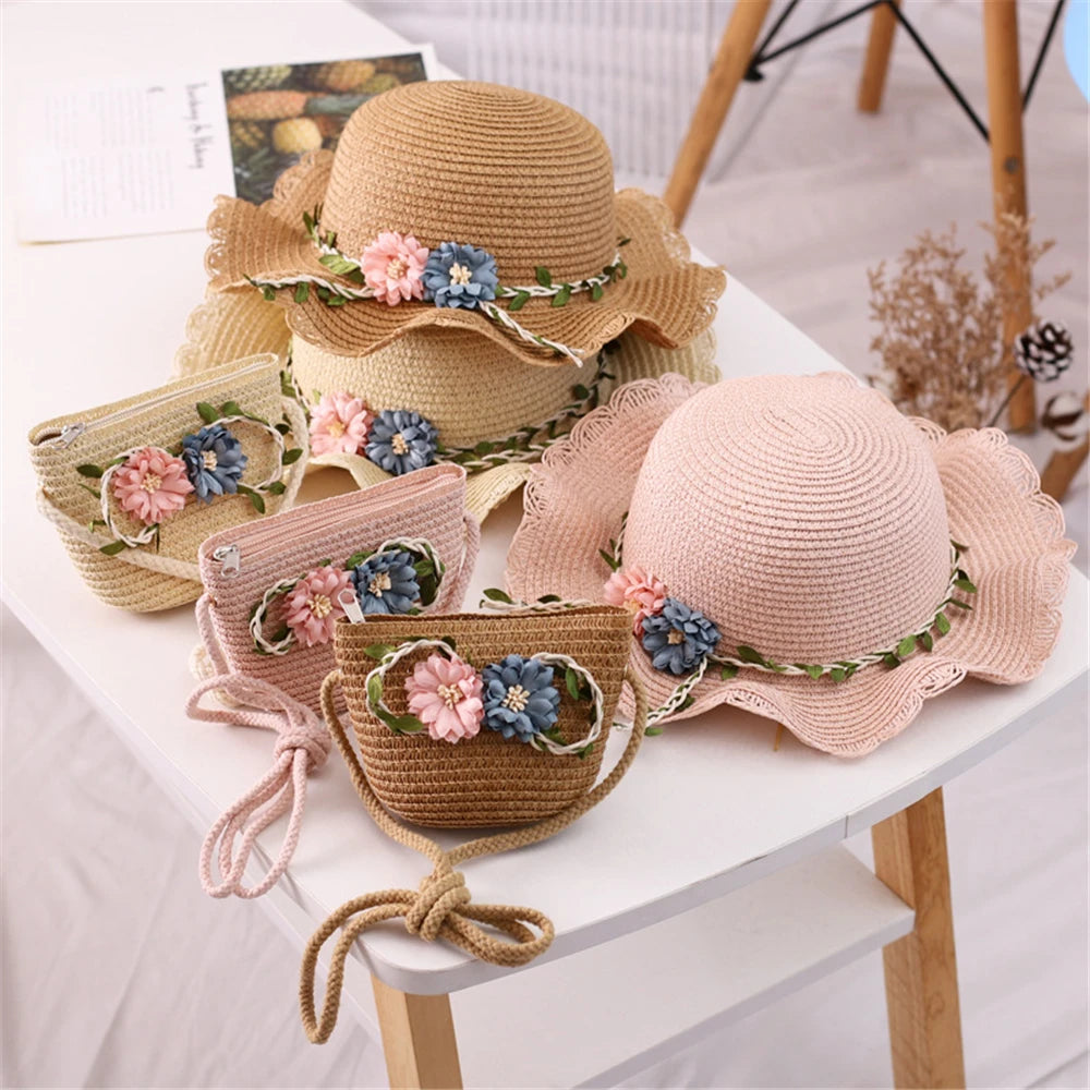 New Summer Kids Flower Caps Bag Girl Sandy Beach Hat Baby Coin Cute Weave Straw Purse Children's Messenger Backpack
